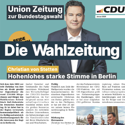 Am vergangenen Wochenende hat der Kanzlerkandidat von CDU und CSU Friedrich Merz die Region Hohenlohe besucht. Bei einem Abendessen am Freitag bei mir in Künzelsau zusammen mit dem CDU-Landesvorstand konnte ich ihm mehrere regionale Projekte erläutern und für deren Realisierung werben.